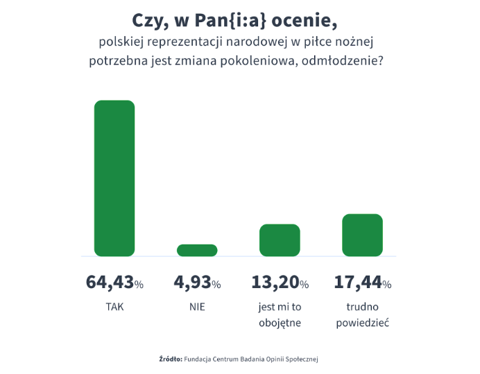 CBOS sprawdził również opinie Polaków na temat zmian kadrowych w reprezentacji. W tym celu zadał pytanie „Czy, w Pana/i ocenie, polskiej reprezentacji narodowej w piłce nożnej potrzebna jest zmiana pokoleniowa, odmłodzenie?”. W tej kwestii Polacy są zgodni – kadra wymaga odmłodzenia. Takiego zdania było ponad 64% ankietowanych, podczas gdy przeciwną opinię wyraziło zaledwie 4,93%.