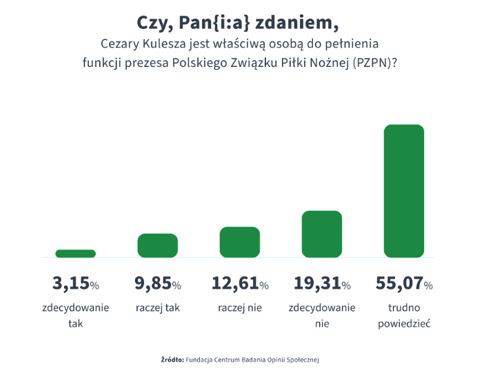 Brak postępów w wymianie pokoleniowej, mniejsze i większe aferki wokół kadry oraz przede wszystkim słabe wyniki i marny styl gry kadry nie wpływają dobrze na postrzeganie Cezarego Kuleszy przez opinię publiczną. Na pytanie „Czy, Pan{i:a} zdaniem, Cezary Kulesza jest właściwą osobą do pełnienia funkcji prezesa Polskiego Związku Piłki Nożnej (PZPN)?” odpowiedzi zdecydowanie negatywnej udzieliło 19,31%, a negatywnej – 12,16%. Pracę Kuleszy pozytywnie lub raczej pozytywnie oceniło zaledwie 13% ankietowanych. Aż 55% nie miało jednak zdania.
