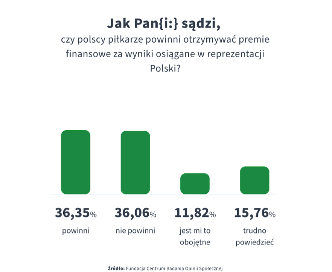 Polacy wydają się za to znacznie mniej wymagający wobec piłkarzy kadry. Na pytanie „Jak Pan sądzi, czy polscy piłkarze powinni otrzymywać premie finansowe za wyniki osiągane w reprezentacji Polski?”, zdania były podzielone praktycznie w stosunku 50-50. Z jednej strony, pokazuje to, że jako naród cenimy naszych kadrowiczów. Z drugiej strony, wielu fanów piłki pamięta słynną „aferę premiową” sprzed Mundialu 2022, gdy premier Morawiecki obiecał zawodnikom 30 mln zł za awans do 1/8 finału, a temat pieniędzy podzielił kadrę.