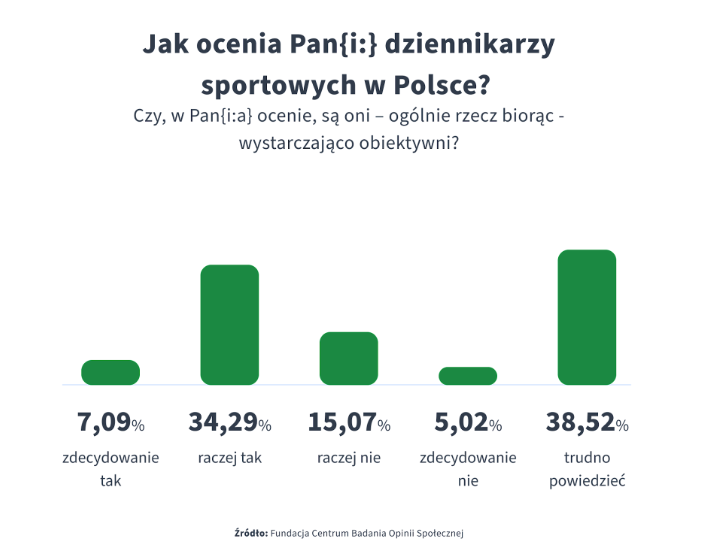 Na koniec, warto również wspomnieć o tym, co Polacy myślą o polskich dziennikarzach sportowych. W badaniu CBOS ich obiektywność pozytywnie oceniło łącznie ponad 41% ankietowanych, podczas gdy negatywnie – 20%. Rola mediów w relacjonowaniu i komentowaniu sytuacji wokół kadry jest więc istotna i na pewno wpływa na kształtowanie opinii wśród wielu fanów sportu.