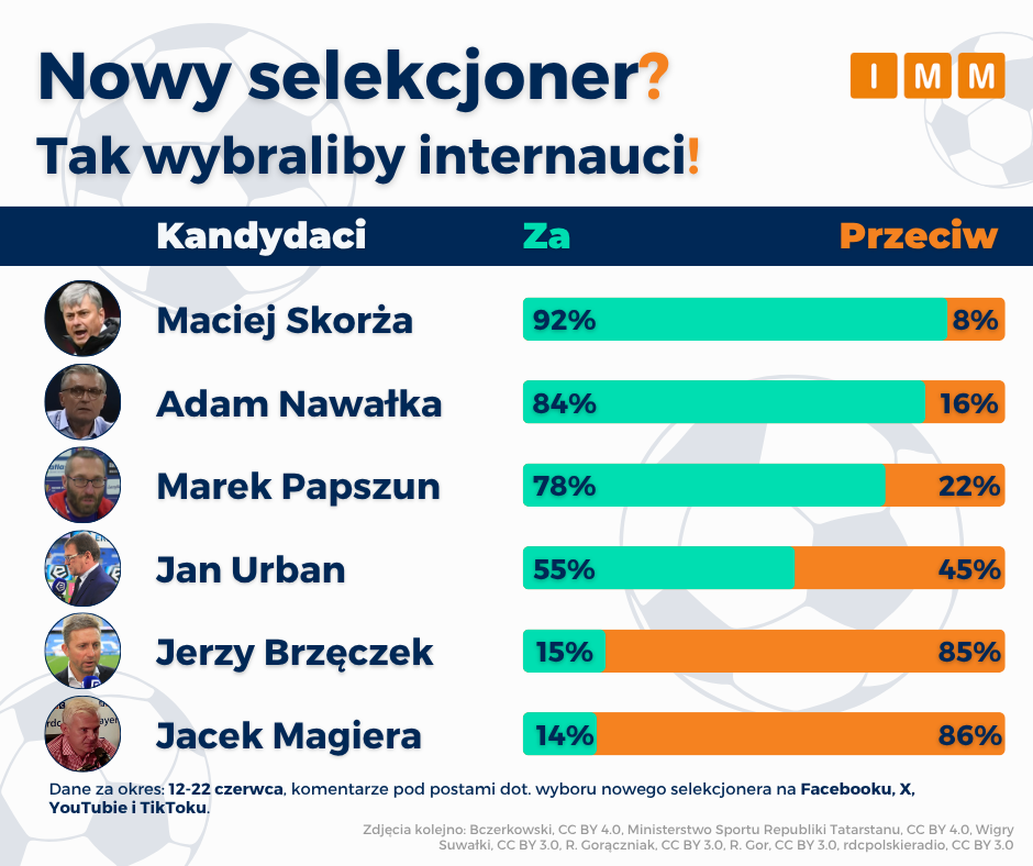 Analiza Instytutu Monitorowania Mediów, przeprowadzona w okresie 12-22 czerwca 2025 roku, obejmowała komentarze w mediach społecznościowych (Facebook, X, YouTube, TikTok), które zawierały wspomnienie przynajmniej jednego kandydata na funkcję selekcjonera polskiej reprezentacji.