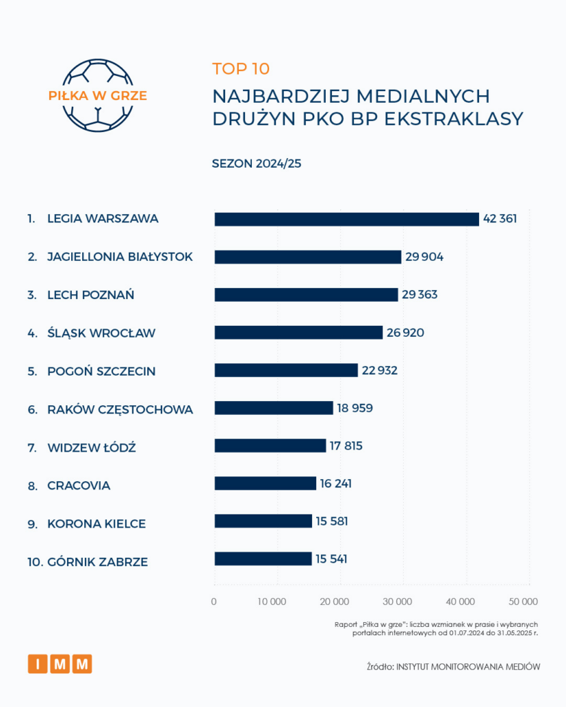 – Miniony sezon pokazał, jak wielkie znaczenie dla medialności mają sukcesy na arenie międzynarodowej – nawet kosztem tytułu mistrzowskiego w kraju. Lech Poznań został mistrzem Polski, ale to Legia Warszawa i Jagiellonia Białystok znalazły się wyżej w rankingu medialności dzięki swoim pucharowym przygodom, co z pewnością jest istotne dla potencjalnych sponsorów drużyn – większa ekspozycja w mediach zagranicznych i relacjach z europejskich rozgrywek oznacza szerszy zasięg, dotarcie do nowych grup kibiców i wzmocnienie wizerunku marki poza granicami kraju – komentuje Tomasz Lubieniecki, Kierownik Działu Raportów Medialnych w IMM.