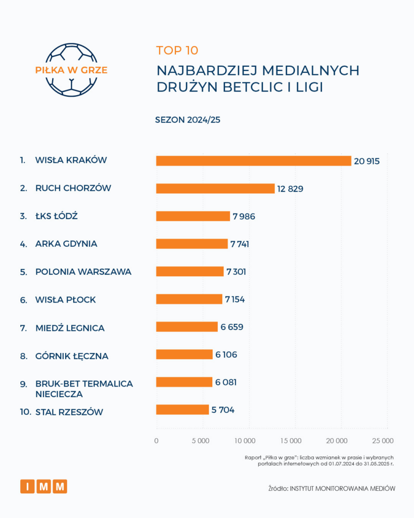 W rozgrywkach Betclic 1. Ligi najwięcej uwagi przyciągały Wisła Kraków, Ruch Chorzów i ŁKS Łódź. Choć żaden z tych klubów nie awansował do Ekstraklasy, to medialnie zdominowały one przekaz przez cały sezon. Wisła Kraków zakończyła rozgrywki na czwartym miejscu i odpadła w półfinale baraży po porażce z Miedzią Legnica, ale wcześniej zyskała ogromną widoczność dzięki udziałowi w rozgrywkach międzynarodowych i zorganizowaniu historycznego „Meczu Mistrzów” z Ruchem Chorzów, który obejrzało ponad 53 tysiące widzów.
