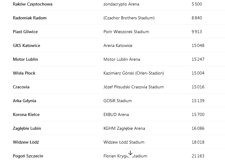 - Najmniejszy stadion: Bruk‑Bet Termalica – 4 666 miejsc.