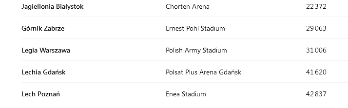 - Największy stadion: Lech Poznań – 42 837 miejsc.
