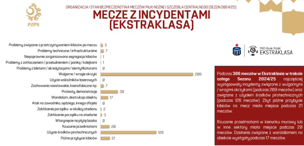 - W Ekstraklasie najczęściej odnotowywano pirotechnikę i okrzyki wrogie (wulgaryzmy, ksenofobia).