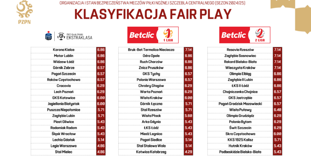 - Raport prezentuje dane ilościowe z podziałem na poszczególne ligi centralne (Ekstraklasa, I liga, Puchar Polski) oraz fazy sezonu (jesień/wiosna).