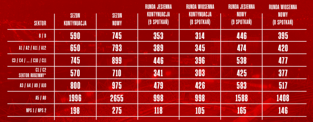 Jeśli chodzi o ceny karnetów od najtańszych do najdroższych na cały sezon, prezentują się one tak: