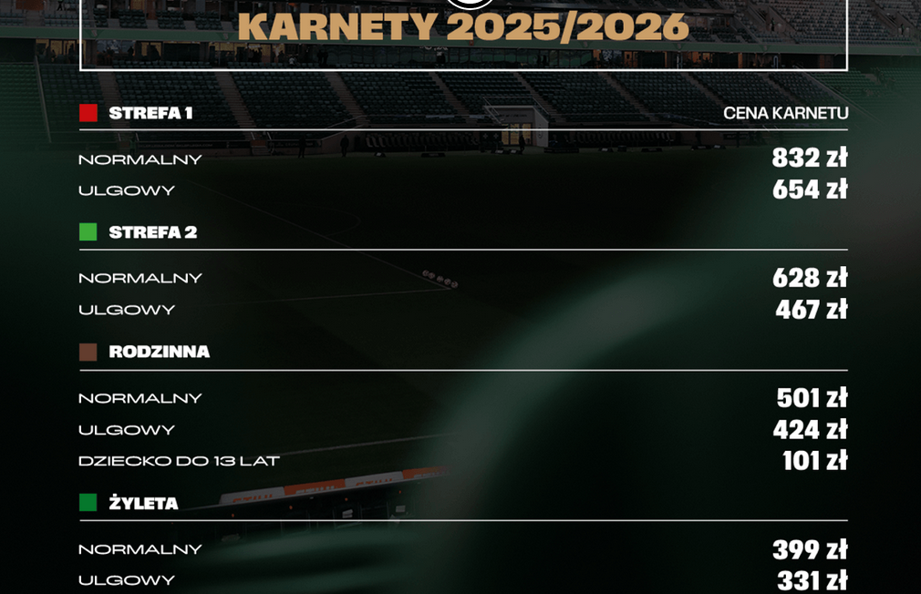 Karnet sezonowy można kupić za 740 (Strefa B) lub 1030 złotych (Strefa A), a w abonamencie zawarte jest 17 spotkań, które Kolejorz rozegra w ramach rozgrywek PKO BP Ekstraklasy.