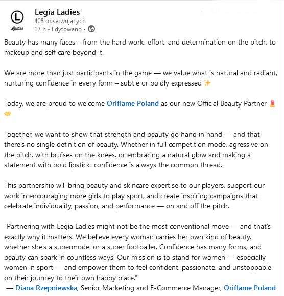 – Partnerstwo z Legia Ladies może nie być najbardziej konwencjonalnym posunięciem – i właśnie dlatego jest ważne. Wierzymy, że każda kobieta nosi w sobie swój własny rodzaj piękna, niezależnie od tego, czy jest supermodelką, czy superpiłkarką. Pewność siebie ma wiele form, a piękno może rozpalać zmysły na niezliczone sposoby. Naszą misją jest wspieranie kobiet – zwłaszcza kobiet w sporcie – i wspieranie ich, aby czuły się pewne siebie, pełne pasji i niezwyciężone w drodze do własnego szczęścia – mówi Diana Rzepniewska, Starszy Kierownik ds. Marketingu i E-Commerce, Oriflame Polska