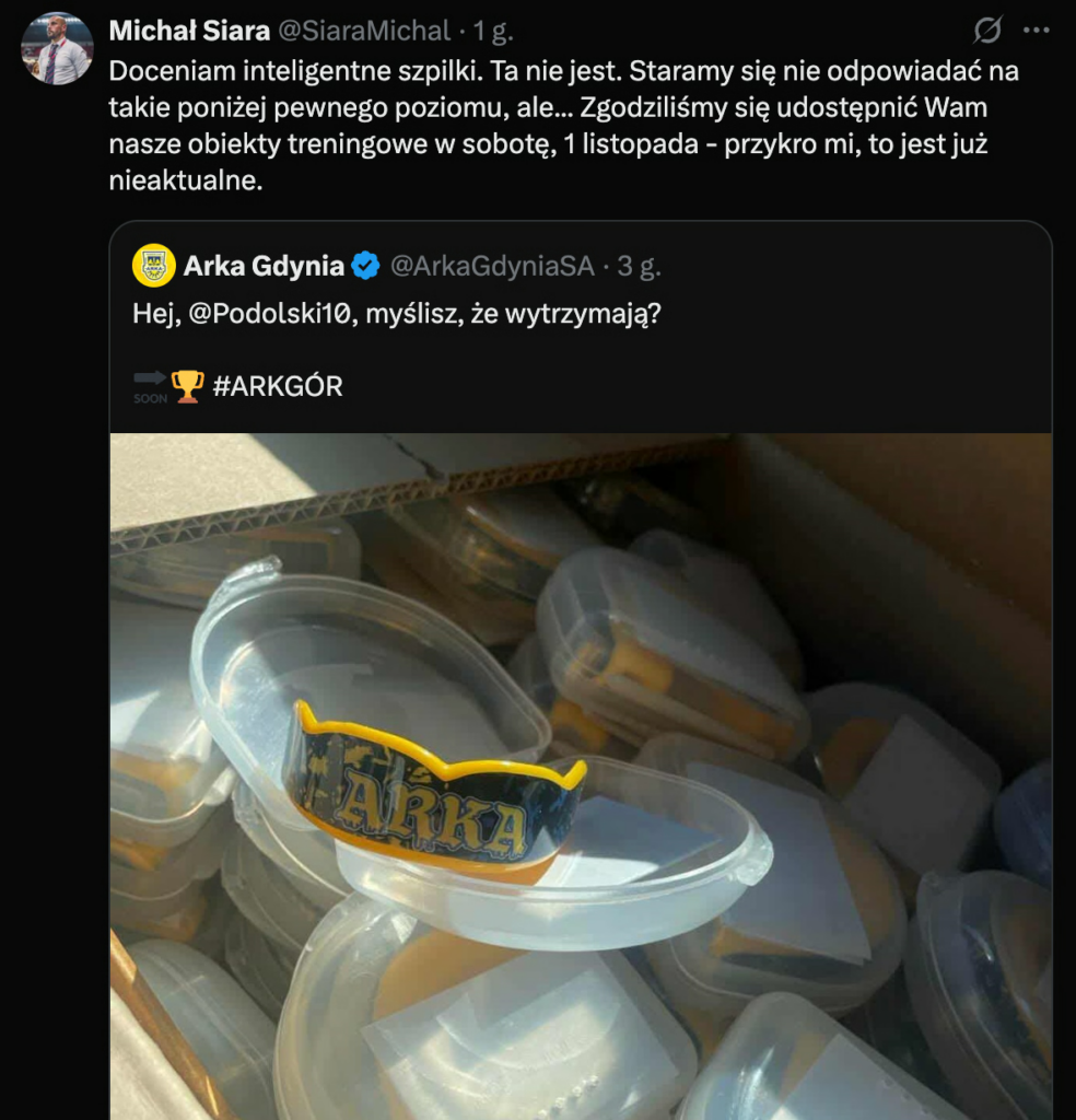 Wydaje się, że Arka Gdynia zastosowała błyskotliwy RTM, który był kąśliwy, jednak zapewne gdynianie nie spodziewali się, że reakcje ze strony Górnika na ich publikację w social mediach będą aż tak kategoryczne. To sprawiło, że Michał Siara stał się obiektem kpin w sieci wśród kibiców w zasadzie wszystkich drużyn.