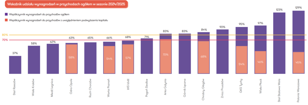 Raport pokazuje również, że wskaźnik wynagrodzeń do przychodów wyniósł 129%, co oznacza, że wydatki na pensje zawodników i pracowników przewyższały przychody klubu. Był to najgorszy wynik w lidze. Warto jednak podkreślić ze po podwyższeniu kapitału wskaźnik spadł do 45%, co pokazuje, że dzięki wpływom prezesa, Polonia jest stabilna finansowo. Klub funkcjonuje bez zadłużenia, wszystkie płatności realizowane są terminowo, a pracownicy i zawodnicy otrzymują wynagrodzenia na czas.