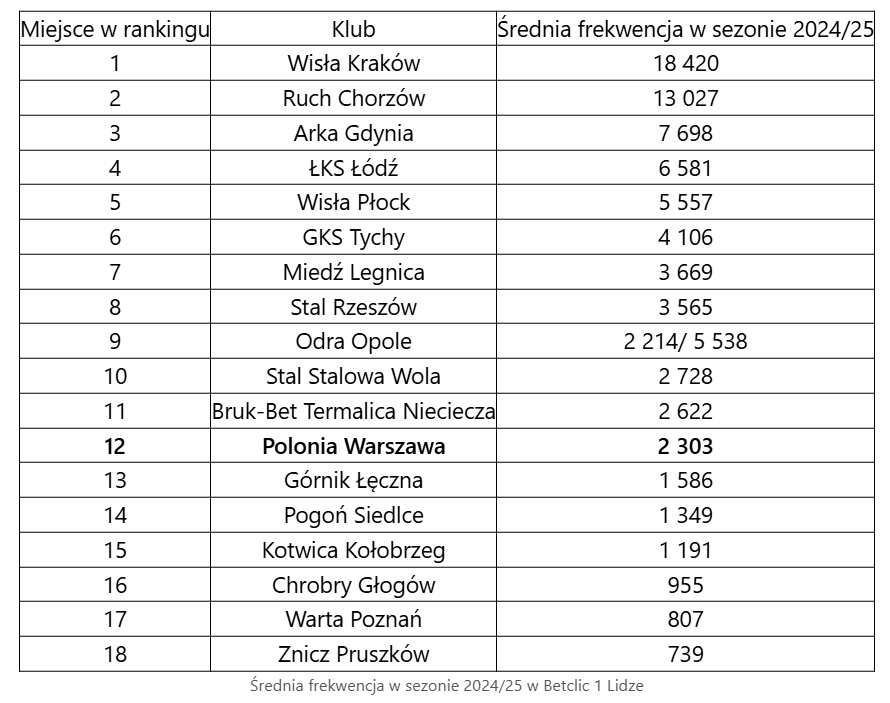 Według raportu, średnia frekwencja na meczach Polonii w sezonie 2024/25 wyniosła około 2 300 osób, co plasuje klub dopiero na 12. miejscu wśród drużyn 1. ligi – mimo że klub funkcjonuje w największym mieście w Polsce, z ogromnym potencjałem kibicowskim. Dla porównania, kluby z mniejszych miejscowości – jak Płock, Łódź, Opole, Stalowa Wola, Legnica, Kraków, Rzeszów, Chorzów, Tychy czy Gdynia – regularnie przyciągają znacznie większą publiczność. Mniejsze zainteresowanie przekłada się bezpośrednio na wyniki finansowe i ogranicza możliwości rozwoju klubu.