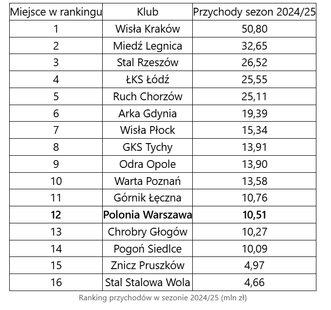 W przypadku Polonii Warszawa dane z sezonu 2024/2025 pokazują jednak zupełnie inny obraz. Ponad 65% wszystkich środków pochodzi z prywatnych funduszy prezesa Gregoire’a Nitot oraz firmy Sii Sp. z o.o., który od 2020 roku zasilił klub kwotą przekraczającą 44 miliony złotych. Tymczasem wpływy od kibiców – obejmujące sprzedaż biletów, klubowej gastronomii i gadżetów – wyniosły około 2,5 miliona złotych.