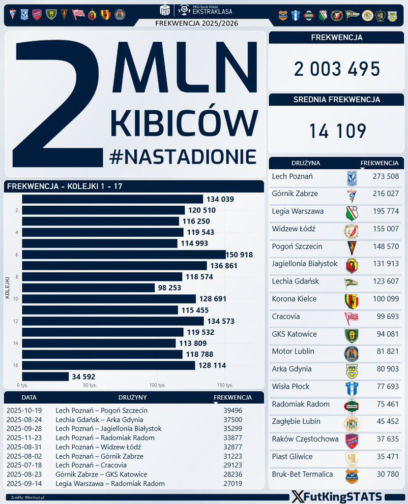Obecnie wiemy, że na wszystkich stadionach od początku sezonu było 2 003 495 kibiców, a średnia frekwencji wynosi 14 109 fanów.