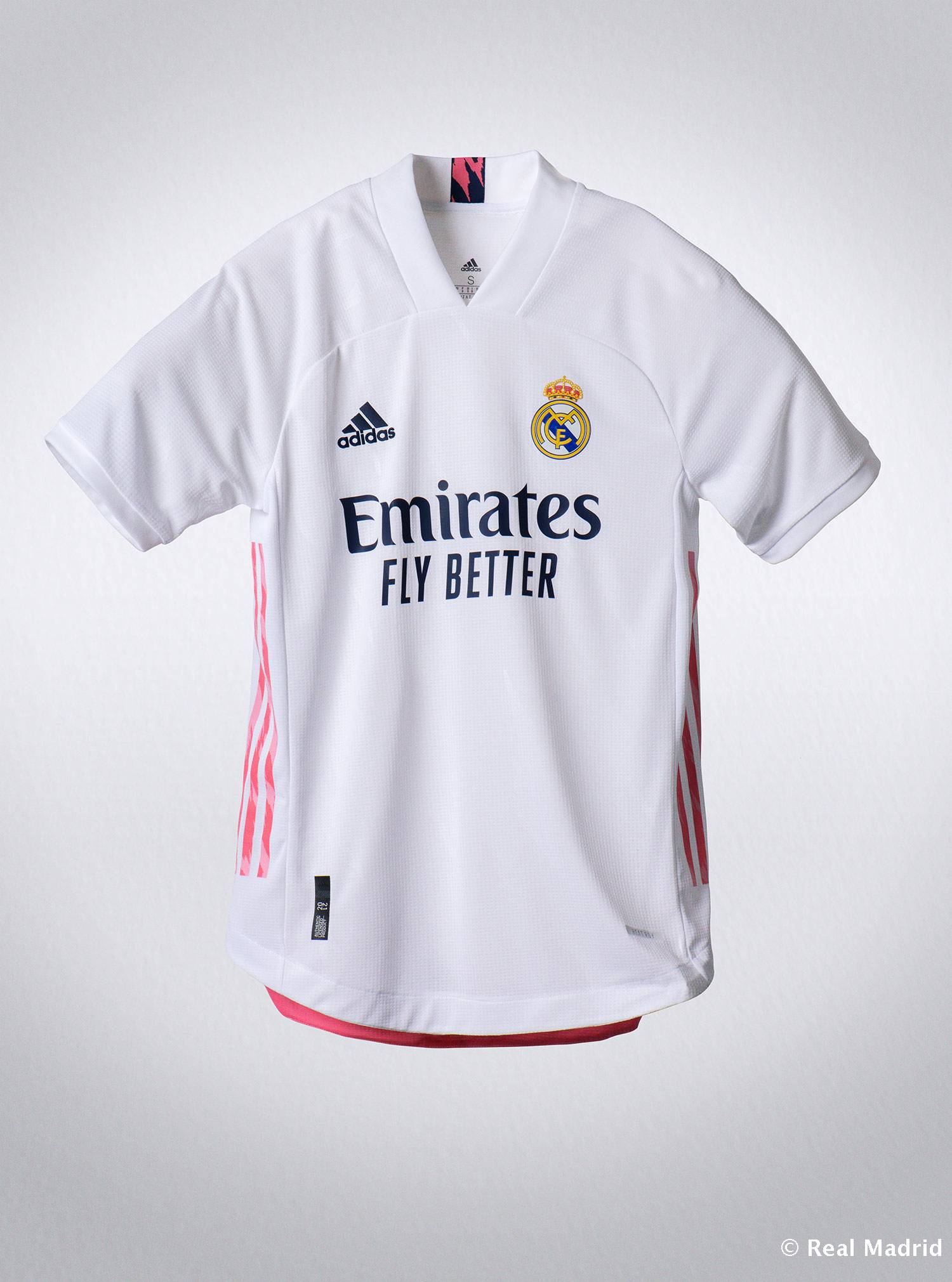 Pierwszy komplet strojów Realu to klasyczna biel z trzema różowymi paskami po boku i delikatnym akcencie na karku, które zastępują złote akcenty. Na domową koszulkę wraca również cięty kołnierzyk w kształcie litery V i subtelny detal graficzny, nawiązujący do współczesnej kultury stolicy.![]()