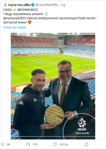 W środę Michniewicz pojawił się na Villa Park i z wysokości trybun obejrzał spotkanie gospodarzy z Leeds (3:3 – przyp. red.). Po meczu doszło do spotkania szkoleniowca z Cash`em. Boczny defensor dotrzymał obietnicy i przekazał Michniewiczowi sernik. Następnie piłkarz z przymrużeniem oka napisał na swoich social mediach: – Szef powiedział, że smakowało niesamowicie