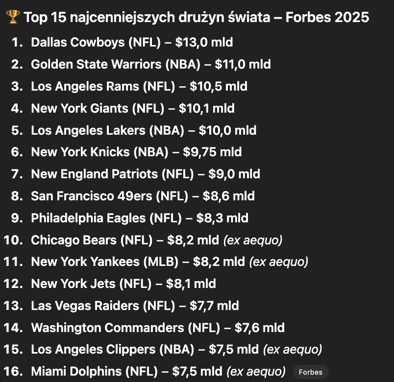 Forbes opublikował coroczną listę 50 najbardziej wartościowych drużyn sportowych świata za rok 2025. Ranking pokazuje ogromny wzrost wartości zespołów, które łącznie są warte ponad 353 miliardy dolarów, ze średnią wartością około 7,1 mld dolarów na drużynę – wzrost o 22% w porównaniu z 2024 rokiem.